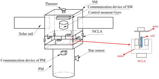 The structure of the NCCPFS is shown in Figure 1. The PM mainly installs the components that require vibration isolation such as telescopes, radars, cameras, as well as sensitive elements like star sensors and gyroscopes. The SM mainly installs the power component, attitude component, and communication component. The power component is solar sails, the attitude component includes thrusters and flywheel, and the communication component includes antennas and a data transmission receiver. The flexibility of solar sails and antennas as well as the vibration generated by thrusters and flywheels during operation will greatly impact the ultra-stable control of high-precision payloads [21]. Therefore, in order to isolate the influence of interfering factors on the PM, the two modules are connected by eight orthogonally mounted NCLAs, which generate Lorentz forces that act on both the PM and the SM. The control system of the SM is basically the same as the traditional satellite control system, and the attitude of the PM is used as the reference for tracking control. During the in-flight maneuvering, the two modules will both rotate around the center of mass of the PM to avoid collision. Obviously, these NCLAs serve as the execution units for PM attitude control and relative position control between the two modules. When the PM is in motion, the SM will track the attitude of the PM using flywheels. To maintain the relative position between the two modules and avoid collisions, the NCLAs will generate Lorentz forces on the PM, synthesizing control moments to drive the rotation of the PM.