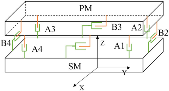 The installation positions of the eight NCLAs are shown in Figure 4, with the stator of each NCLA mounted on the SM and the rotor mounted on the PM. The direction of magnetic induction intensity generated by the stators A1, A2, A3, and A4 are perpendicular to the satellite installation plane. The direction of magnetic induction intensity generated by the stators B1, B2, B3, and B4 are parallel to the satellite installation plane. Eight NCLAs are symmetrically arranged, with each NCLA only generating forces along one of the x, y, or z axes. By A1, A2, A3, and A4, the rotation of the PM around the x direction is realized. The rotation of the PM around the y direction is realized by A1, A2, A3, and A4. The rotation of the PM around the z direction is realized by B1, B2, B3, and B4.