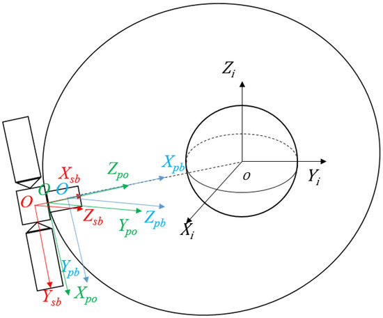 The premise of the in-flight calibration is to establish the coordinate system and dynamic model that meet the requirements of the satellite attitude control. It can be seen from Section 2 that the special connecting structure between the two modules of the NCCPFS lead to the requirement of establishing an effective two-module cooperative control strategy.
