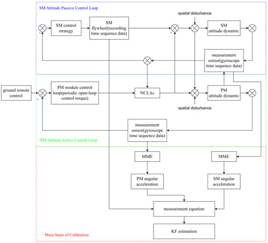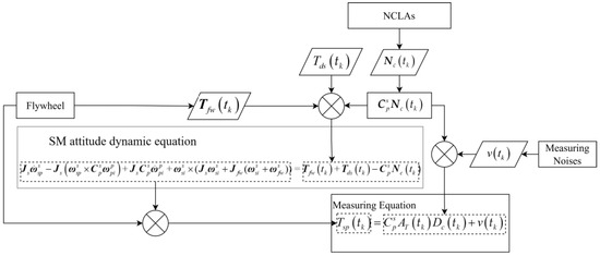 As shown in Figure 6, an attitude control command is sent to the NCLAs to generate periodic control torques acting on the PM, causing changes in the PM’s attitude. In order to maintain relative attitude stability between the two modules, the SM generates the corresponding control torque through the flywheel to adjust its attitude and compensates for the environmental disturbance torque to realize passive control. In this way, we can acquire the calibrated measurement equations and state equations.