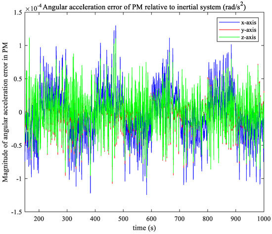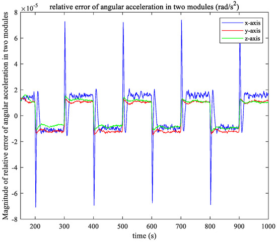 The error between the angular acceleration of the PM estimated by the MME algorithm and the actual measured value of the angular acceleration can be seen in Figure 13, and the error of the angular acceleration of the two modules can be seen in Figure 14.