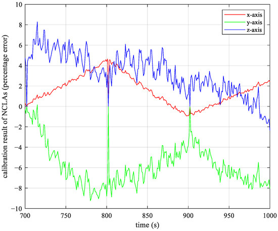 In addition, Figure 15 exhibits a phenomenon where the calibration error quickly converges to zero and then quickly approaches the original curve. This is because, at that moment, the output torque of the NCLAs is zero, resulting in a division by zero when calculating the percentage. Therefore, it is considered that there is no error when the output of the NCLAs is zero. Similarly, the abrupt change in Figure 14 is due to the reversal of the output direction of NCLAs around this time, while each cycle of the MME/KF algorithm selected in this article will adopt the last calculation data. When the thruster direction is reversed, the difference between the two calculations increases dramatically, resulting in an abrupt change in the relative error between the two modules.