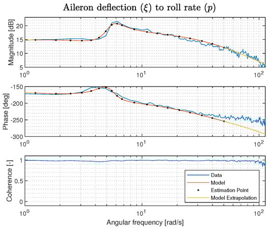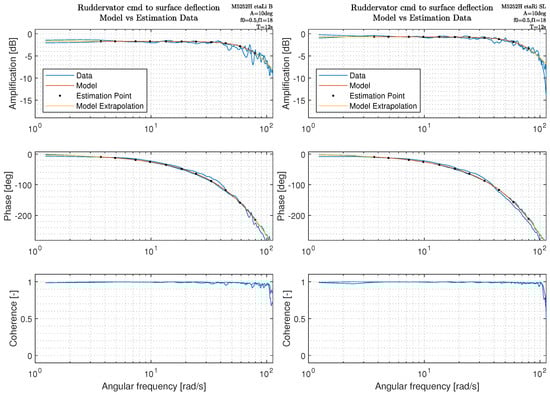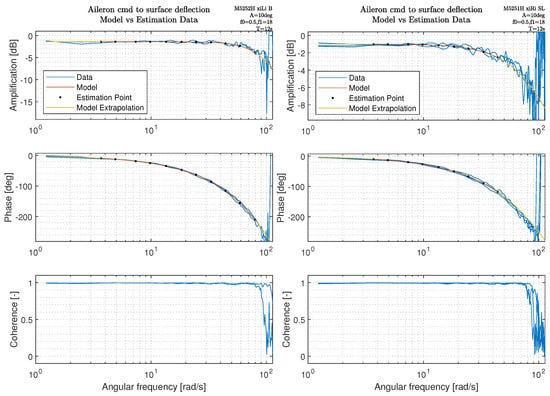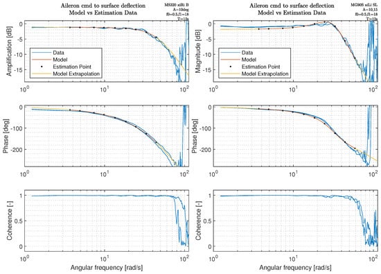 which reduces the weighting of the data points as the coherence decreases; e.g., when γ x y 2 = 0.6 the weight on the squared error is reduced by 50 % . The frequency response estimation is performed with MATLAB tfestimate() to obtain G ^ l , using Welch’s estimation method and the H 1 estimator. The optimization problem for the cost function in Equation (2) is solved using the MATLAB fminsearch() function, which uses the Nelder–Mead simplex direct search method, a derivative-free, unconstrained multivariate optimization method. Equally logarithmically spaced frequency points were chosen on a range where the crossover frequencies of the final control law were expected to be placed with a good margin on either side. The expected range of the controller crossover frequencies is ω [ 1 : 45 ] rad/s, based on engineering judgement by testing hypothetical actuator performance values and performing the associated control design. At high frequency, several of the actuators deviated from second-order behavior, and this part was neglected in the estimation by reducing the highest estimation frequency. In Figures (Figure 3, Figure 4 and Figure 5), the frequency points for model estimation are indicated with black dots, the model response is indicated with a red line in the region of estimation, and a yellow line for the extrapolated part. Each figure contains a marking in the top right with relevant actuator and maneuver setup. “xiLi B” indicates aileron (xi) on the left side (L) using the inner (i) deflection measurement device. The linkage type is indicated with (B) for ball link and (SL) for standard plastic bearing. Also, the amplitude (A), start and end frequency (f0 and f1) and sine-sweep length (T) is indicated. The estimated model parameters are given in Table 3.