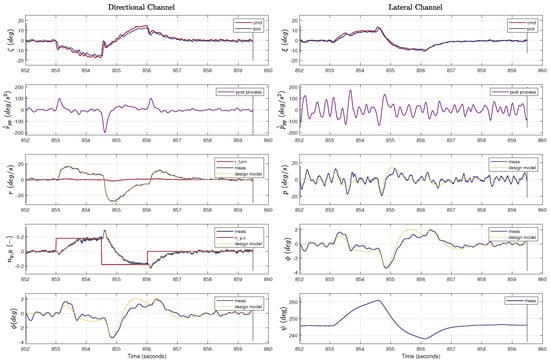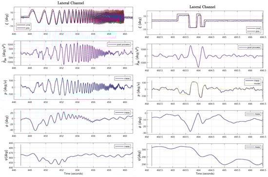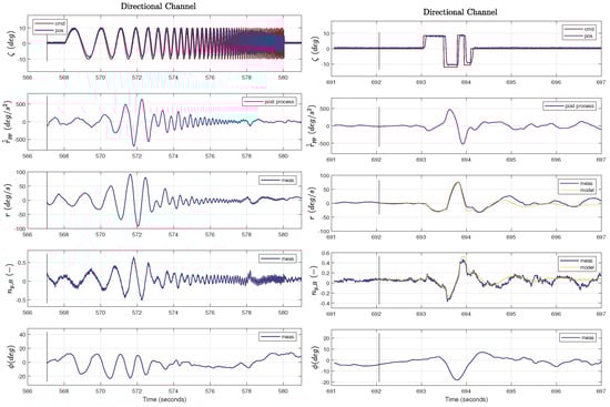 A single sine-sweep run of the lateral and the directional channel (flown separately) is shown on the left in Figure 6 and Figure 7, respectively. For the sine-sweep on the (virtual) rudder, the low dampened dutch-roll mode is clearly visible in the yaw rate and lateral load factor response. Also, the direct feed-through from the virtual rudder to lateral load-factor is clearly seen at the high frequency part of the sweep as a constant amplitude response in the lateral load-factor. The angular acceleration estimates, p ˙ ^ p p and r ˙ ^ p p , were obtained via post processing the angular rates, with a zero-phase forward–backward derivative filter, and are shown for reference only; the data were not used for estimation. The aircraft was flown between 15 and 50 m above the ground for the system identification and control law verification. It was sought to perform the flight test in low turbulence and low wind conditions. For the data used in this paper, the wind speed was below 4 m/s.