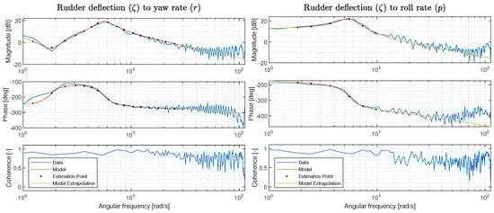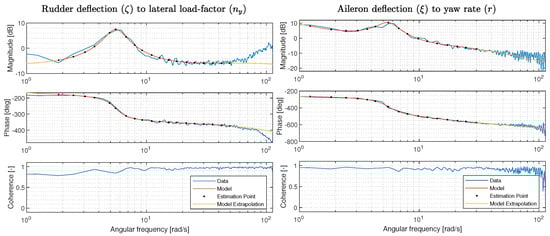 The model parameters to be estimated are listed in Table 4, in addition to the input–output time delay T d . The parameter estimation is performed using the cost function in Equation (2). The model containing the parameters to be estimated is given by Equations (4) and (5), connected with the sensor filters as described in Appendix C.1. This allows one to use the surface deflection measurements as input and the sensor measurements as outputs. For the remaining parameters, V 0 is taken as the average measured velocity for the test runs, for θ 0 the average of the estimated initial pitch angle is used and for the trim angle of attack, the relation α 0 = θ 0 γ 0 is used, where γ 0 is taken as the initial inertial flight path angle estimated from the GPS. The frequency response estimation and optimization is solved in the same manner as the servo-dynamics estimation in Section 2, using the default options for the Welch estimate. As opposed to the SISO servo estimation, the estimation for the plant uses a MISO estimate (using MATLAB tfestimate(___,‘mimo’)) of the frequency response pairs; i.e., both virtual rudder and aileron were used as input, although only the estimation related to the input containing the sine-sweep was used. The other input is there to compensate for the fact that corrective aileron was used during some virtual rudder maneuvers and vice versa to keep the aircraft around the trim point. Five frequency response input–output pairs were chosen for the model estimation, r / ξ , p / ξ , r / ζ , n y / ζ , p / ζ . Aileron to lateral load factor were left out as there is almost no coupling, and the two bank angle pairs were left out, as the bank angle estimate arises from an internal estimation filter, rather than a direct measurement. Often this can be compensated by flight path reconstruction, but was left out in order to avoid introducing more hyperparameters. The frequency estimation region was chosen for the individual pairs according to the quality of the data, i.e., coherence and noise on the frequency response estimate.
