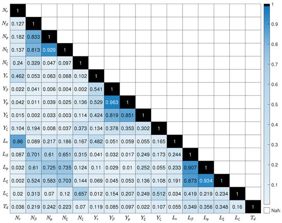 The estimated model parameters are given in Table 4. The input–output time delay was estimated to be 0 s, given by the lower boundary (note that this is the time delay between surface deflection and flight dynamic response, which does not contain the time delay from the actuator commands to the surface deflection response, which was estimated in Section 3). The minimum of the optimization was found at J = 30.9 , which is below the guideline of 50 from [5]. The fit of the model for the considered frequency response pairs is shown in Figure 8, Figure 9 and Figure 10. It is seen that the dutch roll is well identified in the virtual rudder response pairs. In the rudder to lateral load factor frequency response, it was chosen to not include the amplification increase at high frequency (above 50 rad/s), as indicated by the yellow line. As the controller crossover frequencies are well below this value, it was not deemed necessary to increase the model order to capture these dynamics. Also, the aileron to roll-rate frequency response has some discrepancy at high frequency. The flight test data for this estimation had different actuators for each aileron, namely M5252H and M5251H with different bandwidth, which may have led to asymmetric excitation at high frequency. These discrepancies motivate the additional use of non-parametric stability margin assessment considered in Section 5.6. The non-parametric assessment contains all the un-modelled dynamics, and hence provides a higher confidence in the stability and robustness of the control law for the envelope point of the test data. The correlation between the parameter estimates was calculated using a numerical approximation of the Hessian matrix, at the optimal solution for parameters. The estimated correlation matrix is given in Figure 11. It is seen that the correlation is low between most parameters. A general guideline is that a correlation above 0.9 for a given parameter pair can cause problems due to collinearity [4]. High correlations are present for the aileron effectiveness and roll rate parameters, in addition to the high correlation between the side-force coefficient due to side-slip and roll rate. As can be seen from the time domain multistep shown in Figure 6, a small oscillation at around 6 Hz is present at all times in the roll rate response. Further investigation will be conducted into the cause and effect of this, which could arise from wing structural vibration, turbulence or another source.