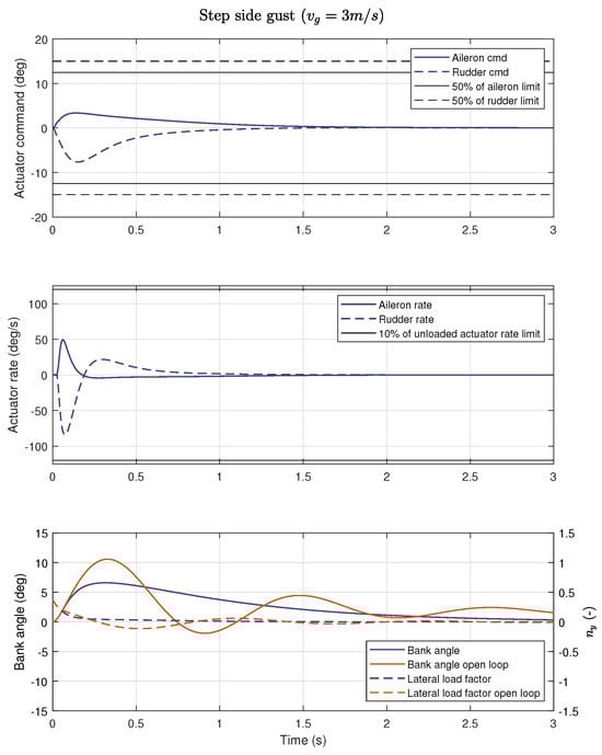 where V 0 is the trim true airspeed, the states r K , β K , p K and ϕ are the kinematic yaw rate, side slip angle, roll rate and bank angle, and the outputs β A and n y are the aerodynamic side slip angle and the lateral load-factor in the aerodynamic frame at the center of gravity. The lateral load-factor is equal to the specific force in the lateral direction denoted f y / g . The inputs ξ and ζ are the aileron and rudder deflections, and v g , p g and r g are the side gust velocity and rotational gust components. N r , N β , N p , N ξ and N ζ are the yaw moment derivatives; Y r , Y β , Y p , Y ξ and Y ζ are the lateral specific force derivatives; L r , L β , L p , L ξ and L ζ are roll moment derivatives. The delta ( Δ ) denotes deviations from the trim state.