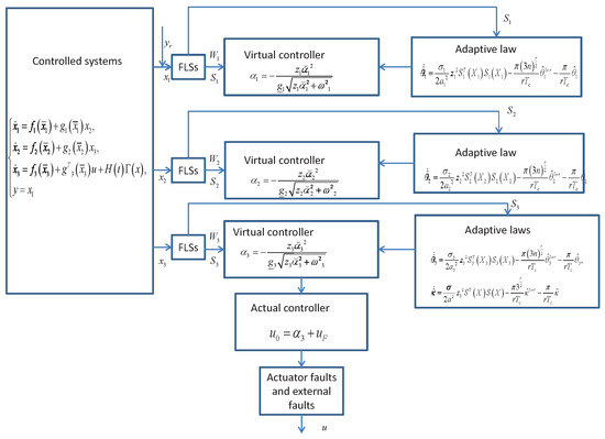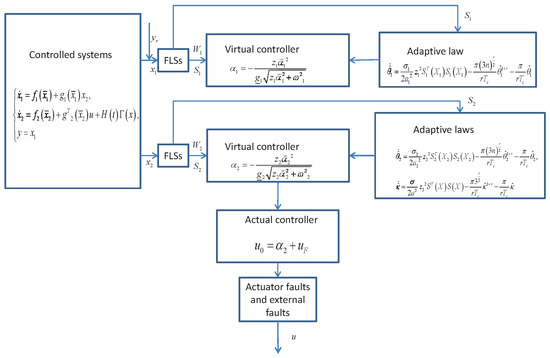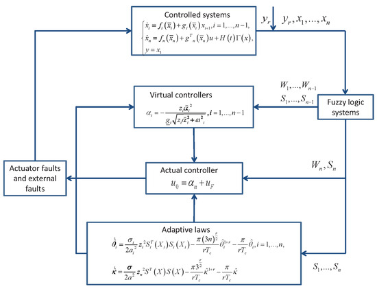 In this section, we construct a predefined-time adaptive fault-tolerant control scheme to handle nonlinear controlled systems with actuator faults and external faults; the block diagram is shown in Figure 1.