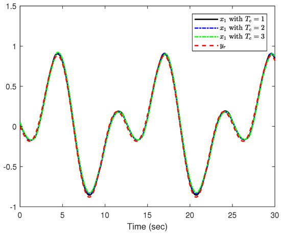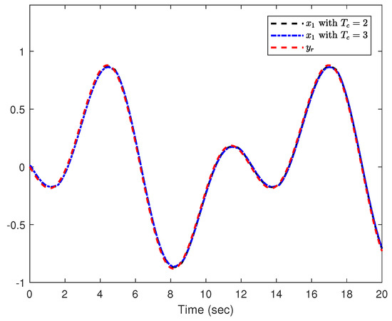 The initial values and adjustable parameters of (90) are represented in Table 2. The predefined times are set to and . The reference signal is . The actuator faults are set to and for , and the external fault occurs at .