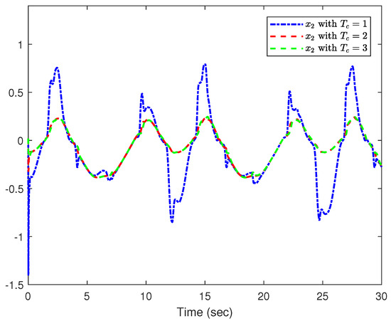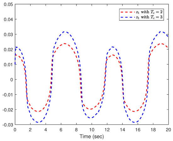 where q stands for the link position, expresses the velocity, and is the acceleration; τ is the torque produced by the motor and is the control input with multiple faults. The parameters are selected to , , . Then, we make , and , and the system (89) can be rewritten as