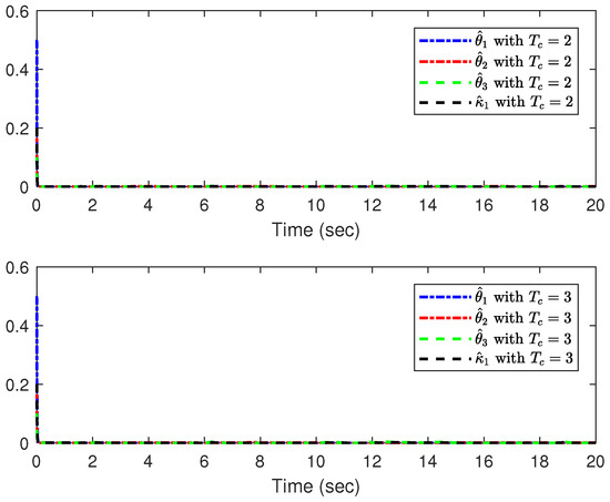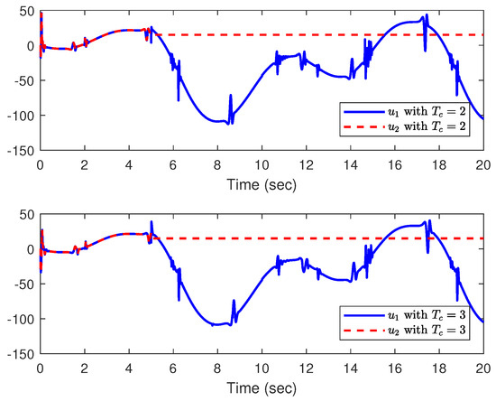 The simulation results are shown in Figure 9, Figure 10, Figure 11, Figure 12 and Figure 13, in which the system output y and tracking signal are represented in Figure 9, Figure 10 displays the tracking error , Figure 11 is the trajectory of the system states and , actual control inputs and are displayed in Figure 12, and Figure 13 expresses the curves of adaptive parameters , , and . According to the results, we can conclude that all the closed-loop system signals meet the predefined time-bound conditions and the tracking error can converge to a predefined neighborhood.