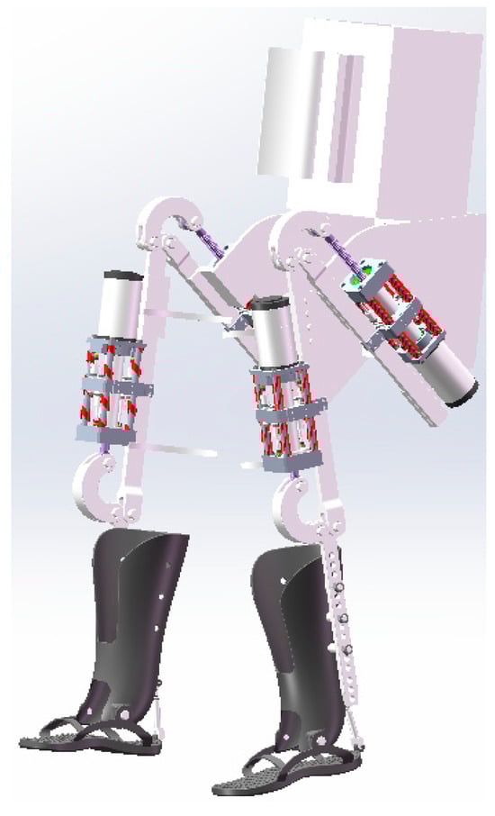 The design of lower limb exoskeleton rehabilitation robots needs to mimic the natural movements of the human lower limbs and provide necessary assistance when needed. Therefore, the structural design needs to consider the degrees of freedom of the knee joint, hip joint, and ankle joint, and ensure that the robot can provide sufficient range and flexibility. The overall structure of the lower limb exoskeleton rehabilitation robot is shown in Figure 5.