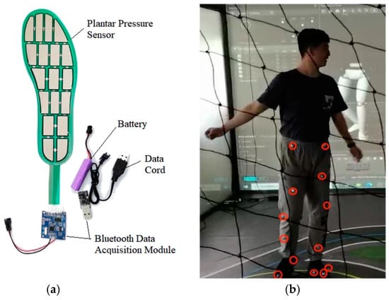 Pressure sensor and marker point distribution diagram: (a) Distributed flexible thin-film plantar pressure sensor; (b) placement of marker points.