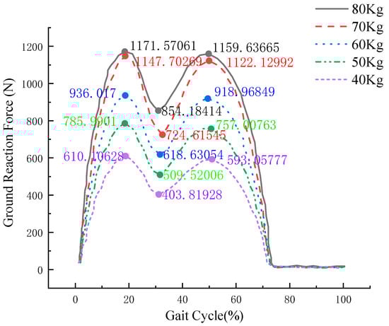 After multiple repeated experiments, the vertical GRF curve during human walking was obtained, as shown in Figure 3. From the graph, it is evident that during walking, there are two distinct peaks. The first peak occurs when the foot touches the ground, with the GRF exceeding the body weight. As the body’s center of gravity crosses the line of gravity, the weight transfers to the contralateral lower limb, leading to a decrease in GRF to its minimum point as the contralateral lower limb first contacts the ground and enters the stance phase. Subsequently, due to the push-off force, the GRF increases, resulting in the second peak, which is similar in magnitude to the first peak. Finally, as the foot leaves the ground, the body enters the swing phase, and the GRF decreases to approximately 0 N. At the same time, through observation, it can be seen that the ground reaction force received is approximately 1.4 times the body weight.