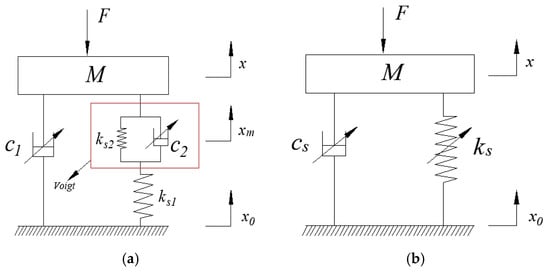 We can simplify the calf of the lower limb exoskeleton rehabilitation robot into a single-degree-of-freedom vibration model, as shown in Figure 4a. This structure, unlike traditional robot calves, not only avoids the impact of pure rigid body structures but also adds a Vogit unit to the existing spring and damping structure. The Vogit unit, composed of a spring and damping in parallel, is then connected in series with the original spring, enabling simultaneous adjustment of the stiffness and damping of the robot calf. The VSDA model consist of two controllable damping MRDs and two fixed-stiffness coil springs. The MRD c2 and coil spring ks2 are connected in parallel to form the Vogit unit, which is then connected in series with the coil spring ks1. Subsequently, the Vogit unit is connected in parallel with the MRD c1. Here, M represents the mass of the human body, F denotes the excitation force applied by the human to the VSDA, x is the displacement of the human body, xm indicates the displacement of the VSDA, and x0 represents the displacement of the ground.