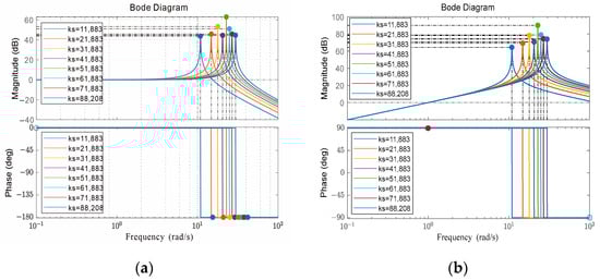 Through the structural analysis of the VSDA, we obtained its equivalent mathematical model. The overall stiffness range of the system is [/, ]. According to the selected spring parameters, = 88,208 N/m and = 13,733 N/m, thus indicating a stiffness range of [11,883~88,208 N/m]. With intervals of 10,000, we selected ks values of 11,883 N/m, 21,883 N/m, 31,883 N/m, 41,883 N/m, 51,883 N/m, 61,883 N/m, 71,883 N/m, and 88,208 N/m, with cs = 0 and M = 100 kg. Using MATLAB/Simulink R2018a software, we analyzed the transfer functions of human displacement and acceleration to obtain Bode plots, as shown in Figure 7.