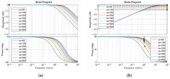 Finally, the system’s damping range was determined to be [80~800 Ns/m]. We selected cs values of 80 Ns/m, 180 Ns/m, 280 Ns/m, 380 Ns/m, 480 Ns/m, 580 Ns/m, 680 Ns/m, and 800 Ns/m, with ks = 0 and M = 100 kg. Using MATLAB/Simulink R2018a software, we analyzed the transfer functions of human displacement and acceleration to obtain Bode plots, as shown in Figure 8.