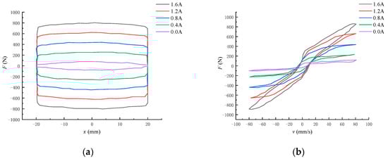 The MRD is a device that utilizes the rheological properties of magnetorheological fluid to adjust damping force. Its damping characteristics depend on the intensity of the magnetic field and the properties of the magnetorheological fluid, as well as the relationship between velocity and displacement []. The output damping mainly responds instantaneously to velocity, while displacement is the result of the long-term effect of velocity. Using a sinusoidal excitation input with an amplitude of 20 mm, frequency of 2 Hz, and velocity of 80 mm/s as an example, the F–x and F–v relationship curves of MRD-1 are shown in Figure 9 for input currents of 0.0, 0.4, 0.8, 1.2, and 1.6 A. Additionally, using a sinusoidal excitation input with an amplitude of 10 mm, frequency of 2 Hz, and velocity of 80 mm/s as an example, the F–x and F–v relationship curves of MRD-2 are shown in Figure 10 for input currents of 0.0, 0.4, 0.8, 1.2, and 1.6 A.
