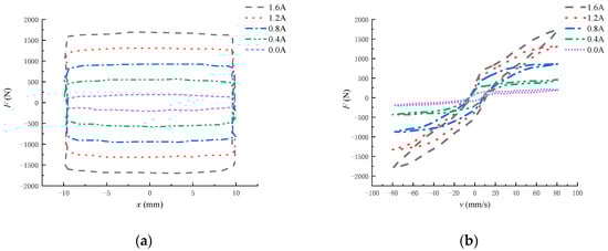 From Figure 9a and Figure 10a, it can be observed that the F–x curve of the dampers exhibits nonlinear characteristics. When the displacement is constant, the damping force increases with the increase in input current. When the input current is constant, the damping force is greater at a displacement close to 0 mm compared to other displacements because the velocity is higher at this point, resulting in a larger damping force. Once the displacement reaches a certain value, the damping force approaches saturation and does not change significantly with further displacement changes.