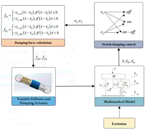 In recent years, magnetorheological (MR) technology has become increasingly mature. Magnetorheological dampers (MRDs) are devices that utilize the rheological properties of magnetorheological fluids to achieve damping regulation. When an external magnetic field is applied, the particles of the magnetorheological fluid undergo rearrangement, altering its flow properties and generating damping effects within the device. Currently, MRDs are widely used in automotive suspension systems, allowing for the adjustment of suspension stiffness and damping effects according to different road conditions and driving requirements [,,]. Moreover, MRDs find extensive applications in various fields such as buildings, bridges, etc. [,]. Furthermore, in the field of robotics, MRDs can be employed to enhance motion control and stability, and reduce vibration and impact. They have been utilized in mechanical arms, bionic legs, bionic joints, smart prosthetics, and other applications [,,,]. In terms of control strategies, semiactive control [,] and Skyhook damping control [] are commonly applied.