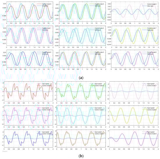 Sinusoidal excitation under 9 control modes simulation results: (a) x–t curve; (b) –t curve.