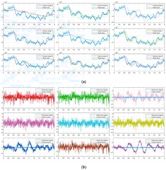 Random excitation under 9 control modes simulation results: (a) x–t curve; (b) –t curve.