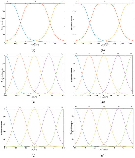 Two input variables are defined with five linguistic variables each: = {Negative Large (NL), Negative Small (NS), Zero (ZO), Positive Small (PS), Positive Large (PL)} and = {Negative Large (NL), Negative Small (NS), Zero (ZO), Positive Small (PS), Positive Large (PL)}. The membership functions used are Gaussian type (gaussmf). The output variables are c1 = {Small (S), Medium (M), Large (L)} and c2 = {Small (S), Medium (M), Large (L)}, with the membership functions being generalized Bell type (gbellmf).To accommodate two different excitation modes, sine excitation and random excitation, under sine excitation, the domain of the input variables is [−0.5, 0.5] and is [−1.6, 1.6], respectively, while under random excitation, the domain of the input variables is [−0.06, 0.06] and is [−0.6, 0.6], respectively. The output variable c1’s domain is [80, 800], and the output variable c2’s domain is [200, 1700] under both excitation modes. The membership degree function curves are shown in Figure 14.