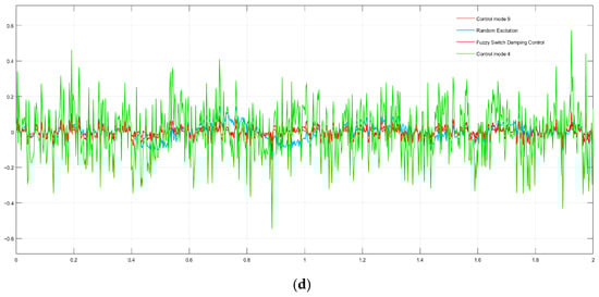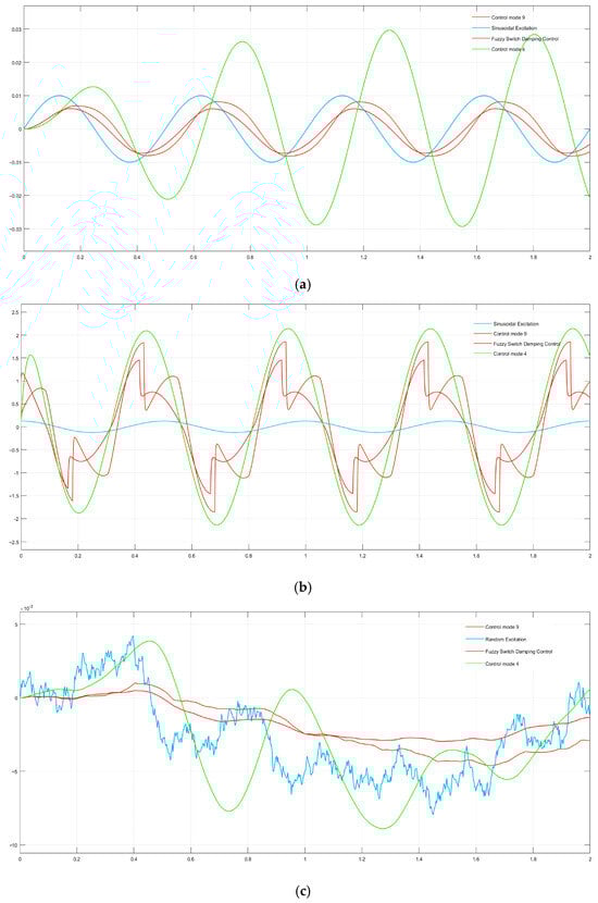 We integrated the constructed fuzzy controller with the previously developed switch damping control as described above, while keeping the system parameters and transfer function of the controlled model unchanged. We already validated that when Control Mode 9, i.e., variable stiffness and variable damping system, is adopted, the control effect on human displacement and acceleration is optimal; and when Control Mode 4, i.e., high stiffness and high damping system, is adopted, the control effect on human displacement and acceleration is the worst. Next, we will only compare the control effects under different excitation conditions for Control Mode 9, Control Mode 4, and the fuzzy switch damping control state; the simulation results are shown in Figure 16, and RMS comparison is shown in Table 8.