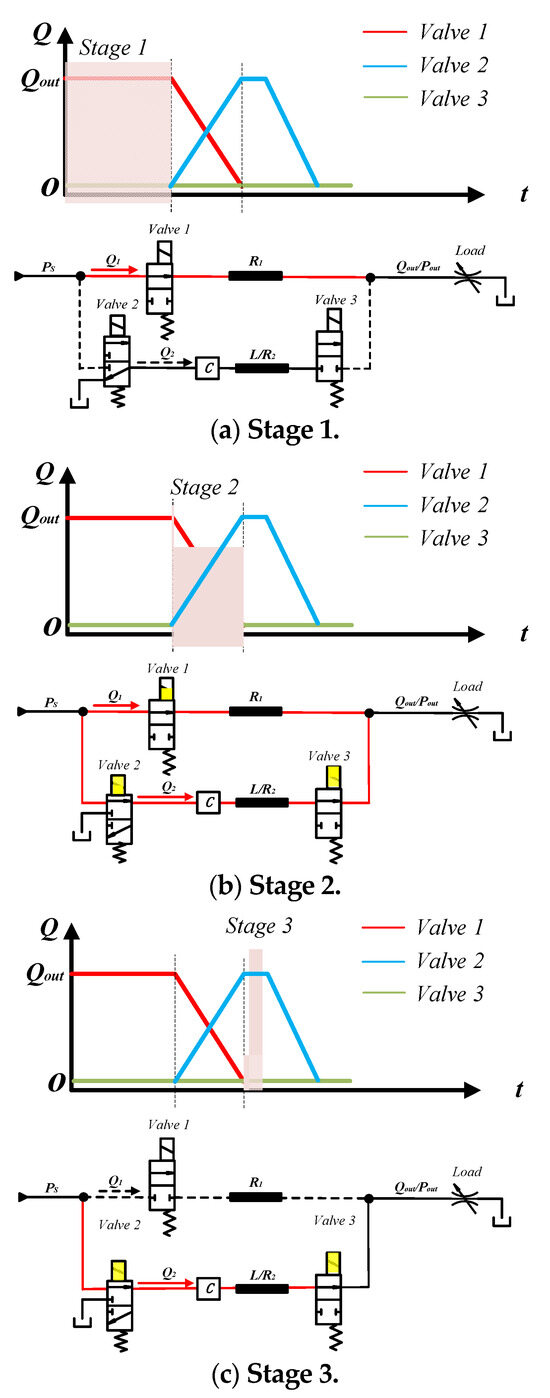 At the beginning of this stage, the flowrate through the main control line has already been at a minimum, when the best time to switch off valve 1 is. After valve 1 is switched off, almost all the flowrate from the power source goes to the capacity. Due to the effect of inductance, the flowrate through valve 3 stays at zero in this stage.