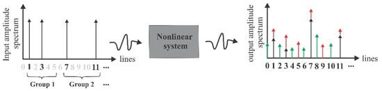 In Figure 1, the spectrum of the odd-random multi-sine (also random-phase) input signal where the detection lines are presented in grey color is shown on the left. Accordingly, each group includes a random selection of odd lines, which are activated within the multi-sine harmonic grid. If the system were linear, it would be expected to acquire only the excited lines (black arrows) in the spectra of the response. However, the spectrum of the unknown odd and even nonlinear distortion is detectable in the right-hand side response by red and green colored arrows, respectively. Consequently, the variance of the odd/even nonlinearities can be quantified. In contrast, the noise variance can be calculated using the non-periodic nature of the noise over repeated periods.