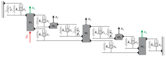 The OBCRP method is implemented using the example of a multi-DoF mass–spring–damper system shown in Figure 2. The system consists of five masses connected with stiffness elements and damping elements , where index serves as a placeholder for the number of each component, which denotes the location in the system. Nonlinear stiffness elements are added for the nonlinear description of the system.