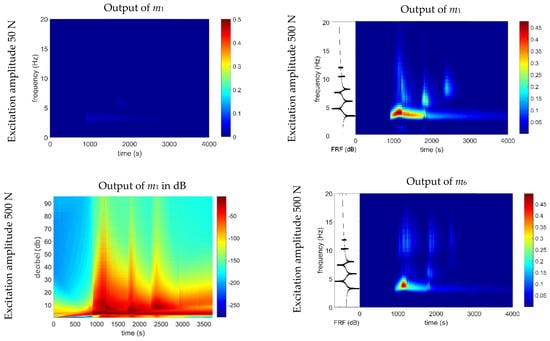 The nonlinearity detection starts with performing the time–frequency analysis based on Morlet wavelet transformation. For the mechanical system in Figure 2, the input/output data is first obtained from the single-reference excitation over , while the measurements are collected from and . Assuming that knowledge regarding the presence of nonlinearity is unavailable, two sets of simulations based on two excitation levels are performed. For this purpose, the system is excited by a chirp signal that sweeps at a rate. For the sake of briefness, the time history of the excitation and system response is suppressed here.
