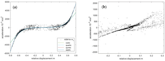 Corresponding side-view (acceleration vs. relative displacement) of the acceleration surface used for nonparametric modeling of nonlinearity at the (a) junction between masses and the (b) junction between masses and .