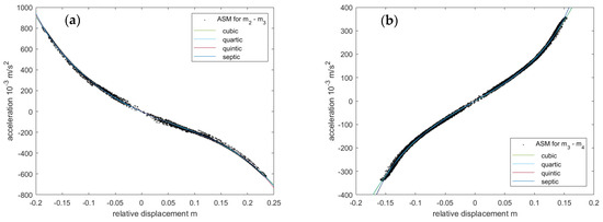 A cross-section along the velocity direction is created to obtain the local nonlinear stiffness curve shown in Figure 5a. In this subplot, the relative velocity range in the ASM is limited to 0.9 m/s in magnitude. Since linear and quadratic functions cannot approximate the obtained stiffness curve, it is fitted by a cubic, a quartic, a quintic, and a septic function, as shown in Figure 5a.
