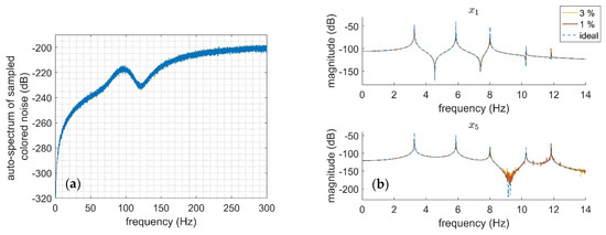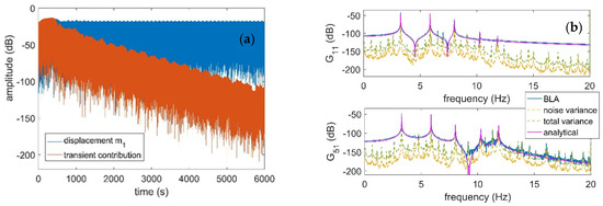 In the context of Equation (1), it can be seen that the process noise in Equation (A7) and, consequently, the nonlinearity contribution can be directly related to the covariance matrix . As a result, an accurate estimate of is a key parameter in the state reconstruction of Equation (1) based on the Kalman filter tuned over the ULM. To accommodate this requirement, the robust LPM, proposed by Pintelon et al. [11,12], has been employed in this paper, the technical details of which are out of the scope of this paper. In this method, by using a periodic excitation signal, it is intended to reduce the effect of the noise transients in the extracted FRF of the system. This is a crucial feature since it provides the means for the extraction of . The mathematics behind the method is based on an approximation of a polynomial function of a predefined order locally for the noise leakage errors. It is worth mentioning that a non-commercial implementation of the robust LPM is available in [39].