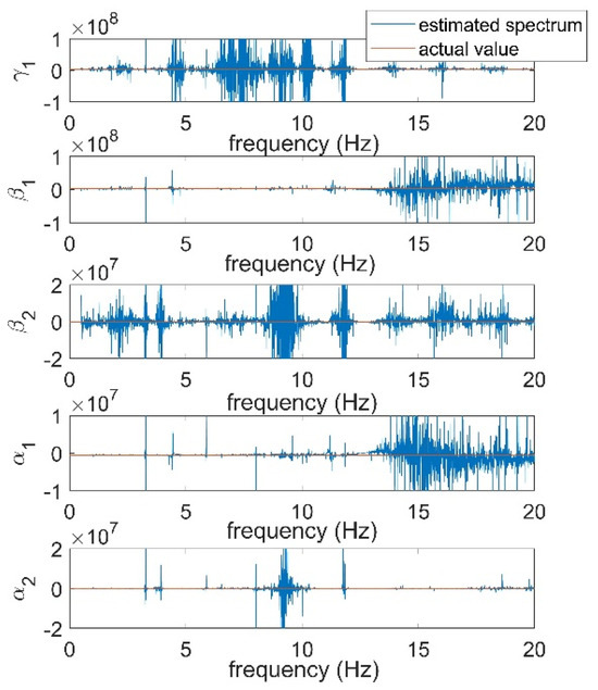 As pointed out in [17] and shown in Step 7 of Algorithm 1, the unknown coefficients of the known analytical nonlinear functions are obtained in the frequency domain. Additionally, the coefficient spectra are severely distorted at frequencies close to a natural frequency, which significantly reduces the estimation quality. Moreover, the coefficient spectra are obtained as a complex value. The biased estimation of the coefficients can be reduced by using the weighting function , and as recalled from [24], this weighting can be selected as where is the imaginary part of the spectrum borrowed from MATLAB notation and indicates absolute value. This weighting is justified by pointing out that the imaginary part of the estimation spectrum must be set to zero due to a lack of physical sense. Although the improvements in the estimation performance using the weighting in [24] are undeniable, we have observed that if the bandwidth of interest encompasses several close natural frequencies, the fluctuations of the imaginary part can be high and wide-band. Additionally, if the imaginary part of the estimated spectra is zero for some frequencies, then is undefined. Consequently, not only the data around the natural frequencies are unreliable in the estimation, but also a wider frequency range should be weighted. More importantly, if the oscillation of the imaginary part is so high that it passes the zero axis, then the calculated mean value based on is wrongly weighted (in addition to the problem of one over zero). In order to solve this issue, we propose using an alternative weighting obtained from Algorithm 2.