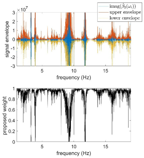 - The introduction of frequency-dependent weighting in the calculation of the nonlinear coefficients in the RP method is motivated by their spectral dependencies. Accordingly, the estimations are polluted by artifacts propagated from the inaccurate estimation of the ULM, which results in a complex (non-real) estimation of the physical variables (the coefficients). The weighting proposed by Muhamad et al. [24] based on the reciprocal of the magnitude of the imaginary part of the estimated spectra is used as a background. Such weighting functions suppress the contribution of highly distorted parts of the estimated data (for the nonlinear coefficients), i.e., parts of the estimated data that have large imaginary parts. We have noticed that not only the contribution of the frequency bandwidth of the data with large imaginary parts should be suppressed in estimating these coefficients, but also a frequency window around that bandwidth should be weighted properly. Additionally, it is observed that the normalization of the frequency-dependent weighting function between zero and one is beneficial in the correct estimation of the coefficients. To this end, it is proposed to employ the normalized envelope of the imaginary part based on the Hilbert finite impulse filter as a new weighting function. It should be noted that we have abandoned the minor revision explained before on the recursive nature of the estimation of the coefficients [24] because it induces negligible improvements at the cost of the enormous computational burden for each unknown coefficient.