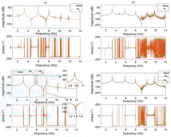 Figure 3 represents the time–frequency analysis of the system presented in Figure 2. At a lower excitation level, it can be observed that the spectrum of the output signal is almost uniform, indicating the negligible effect of the nonlinearity. Here, the result for the DoF of is suppressed since it does not provide additional insight into the nonlinearity behavior. However, if the operational range of the system is at a high excitation level, it is clear from the second column of Figure 3 that the nonlinearities are invoked. To make the contribution of each mode clear, the frequency response function of the ULM (black line in the left part of the figures) is augmented with wavelet-transformed data from the output. Based on the output of for high excitation level, three main distortions are detected at the three fundamental natural frequencies of the system. However, some shifts can be seen between the center of the distortion and the natural frequency value due to the hardening behavior. Additionally, the presence of multiple harmonics of the fundamental natural frequencies is observed by looking at the time–frequency analysis performed for output in dB scale for a broader frequency range of . The distributed spectrum of the signal energy content in this subplot indicates energy transfer from the lower frequencies to the higher ones. It is trivial that mode interaction may happen in this case if the simulation model has natural frequencies at those high frequencies. This kind of interaction in real-time experiments is thoroughly investigated in terms of nonlinear normal modes (NNMs) by Kerschen et al. and Peeters et al. [46,47]. The presence of distortions emphasizes the necessity of using nonlinear approaches such as the OBCRP method to extract the dynamics of the system. Comparing the results of the transformed data in Figure 3 for and , it can be concluded that the nonlinear contribution associated with the fundamental natural frequency propagates over the DoFs of the system; for instance, looking at the time–frequency content of while noting that it is not directly connected to any nonlinear function. Moreover, compared to the literature results for nonsmooth nonlinearities, e.g., SmallSat spacecraft in [48], it is clear that the nature of the nonlinearities is smooth.