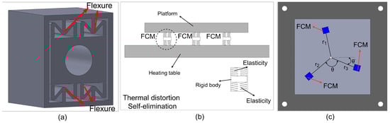 During the process of bonding micro-LED, it is necessary to heat the substrate. However, this high-temperature process can cause thermal errors in the rigid bolt connection mechanism. The mechanism might self-heat and expand, leading to the warping or denting of the nanopositioner []. The overall structure of FCM is shown in Figure 1a, which is symmetrical and has a threaded hole. In this paper, elastic deformation of FCM is used to eliminate heat deformation. Its principle is shown in Figure 1b. Thermal stress and thermal deformation of the nanopositioner are represented by red arrows and red dots. Three sets of FCMs can be installed rotationally symmetrically—two sets of FCMs cannot balance the thermal stress in all directions, while three sets of FCMs can achieve a better balance of thermal stress with the least amount of material—to keep the center of the nanopositioner in an almost constant position. ,, and are the forces produced by the three sets of FCMs counteracting the thermal stress in their direction. The distribution of FCMs in the nanopositioner and the overall view of the nanopositioner are shown in Figure 1c.