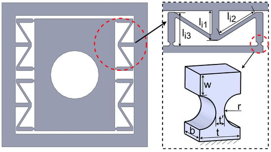 The position sizes of the FCM are , , , and m, as shown in Figure 1b. The FCM structure sizes are , , , b, r, w, and t, as shown in Figure 5. The above size parameters need to be optimized to improve thermal distortion elimination performance and ensure the position accuracy of the nanopositioner. Considering the size of the nanopositioner and the convenience of calculation, we set b = 20 mm and the value range of , , and to 40–50 mm. FCM uses a 3D printing process. Therefore, the range of FCM parameters must meet the processing range. In addition, the parameter range needs to match the design of the nanopositioner. After meeting the above parameter requirements, finite element simulation is carried out on the preliminarily established nanopositioner. By constantly adjusting the parameters, the better parameter range of thermal deformation self-elimination is determined. So, the value ranges of m, , , , r, w, and t are determined by the preliminary finite element simulation analysis. The nanopositioner’s displacement and rotation angle may be affected by thermal distortion. The center position displacement can be represented by and , while the rotation angle displacement is . To eliminate the effects of thermal distortion, here we take the total linear displacement as the optimization goal. Therefore, the optimization problem can be stated as: