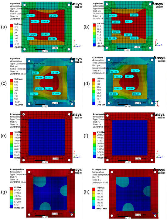Two simulation models were developed: (a) a static positioning platform fixed with FCM (which did not take into account when the platform was in motion); and (b) static positioning platforms fixed with rigid bolts. The boundary conditions for simulation were set, including a convection coefficient between the mechanism and the air of , a thermal radiation coefficient of 0.55, and temperature loads of 333 K and 373 K on the positioning platform. The simulation yielded the thermal deformation of the two models under different thermal loads (see Figure 6c,d,g,h). Finally, the positioning platform warpage of the two models was calculated (see Figure 6a,b,e,f).