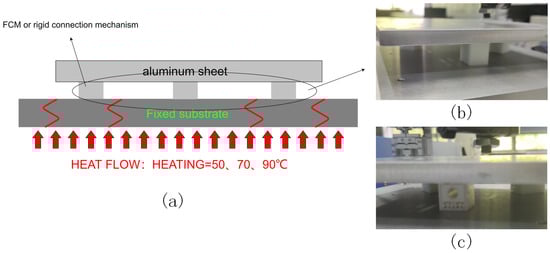 During this experiment, a substrate platform was firmly established, and a heating table was positioned underneath it to efficiently heat the surface, as shown in Figure 7a. Three FCMs were evenly distributed on the substrate, supporting an aluminum plate with a specific weight(see Figure 7b). The experimental protocol dictated that the heating table raise the substrate’s temperature to a predetermined level, subsequently transferring the heat to the FCMs, inducing thermal deformation. Subsequently, the displacement of the aluminum plate at four designated points was meticulously gauged. Following this initial measurement, the FCMs were replaced with a rigid connection mechanism that differed slightly in overall dimensions(see Figure 7c), and the procedure was replicated to assess the aluminum plate’s deformation displacement at the same four points under varying temperature conditions.