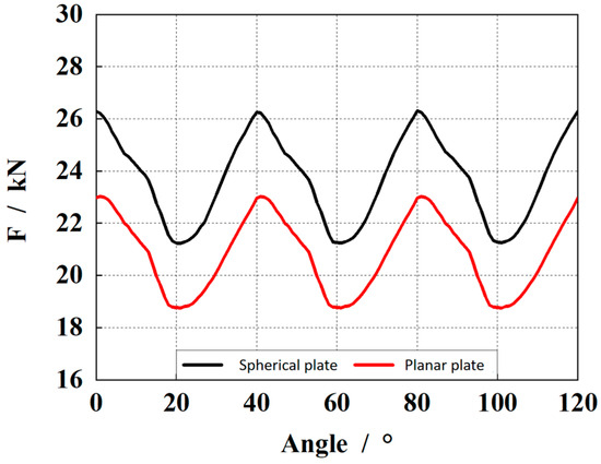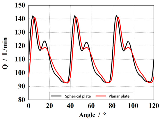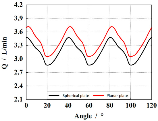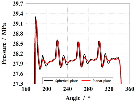 The piston is located at the simulated zero position of the upper dead point. At this time, the piston is connected to the pre-compression groove of the high-pressure chamber, and the piston chamber is under high-pressure conditions. There are five pistons in contact with the high-pressure chamber, and the bearing capacity of the oil film is maximum at this time. Figure 5 represents the outlet flow of the pump. From the figure, it can be observed that the outlet flow under the spherical plate with a spherical radius of 300.6 mm has the same fluctuation amplitude compared with the planar plate structure. Otherwise, the second peak of the outlet flow is also higher, which indicates a higher impact at the outlet.