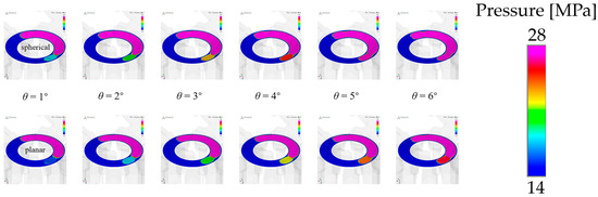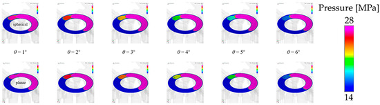 Figure 9 shows the gap oil film pressure distribution during the pre-boost process of the pump. It can be seen that with the rotation of the cylinder block, the pre-boost of the spherical valve pair is faster than that of the planar valve pair. Figure 10 shows the gap oil film pressure distribution during the pre-pressure relief process of the pump. It can be seen that with the rotation of the cylinder block, the pre-pressure relief of the spherical valve pair is faster than that of the planar valve pair. When the maximum pressure of the support oil film occurs, it is mainly during the process of just contact between the piston cavity and the buffer tank (at 2° rotation in the figure).