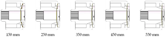 Based on the same original model, the rotor structure of the pump remains the same, and only the spherical radius parameters of the valve pair are changed. The original spherical radius of the plate is 300.6 mm. According to the original spherical radius size of the valve plate, it is divided into five groups of models, which are 150 mm, 250 mm, 350 mm, 450 mm, and 550 mm based on the increment of 100 mm as shown in Figure 11, with the minimum starting from 150 mm and the maximum being 550 mm.