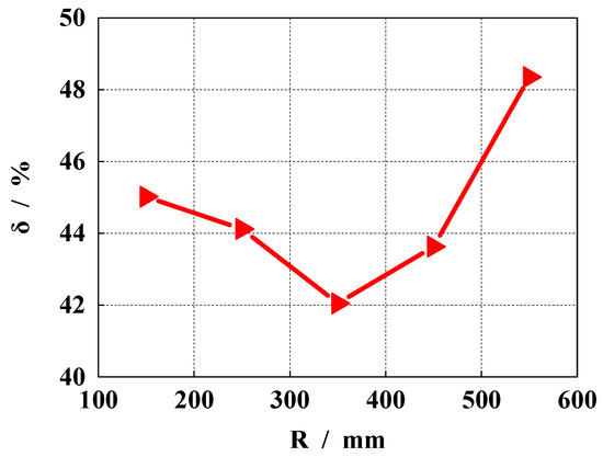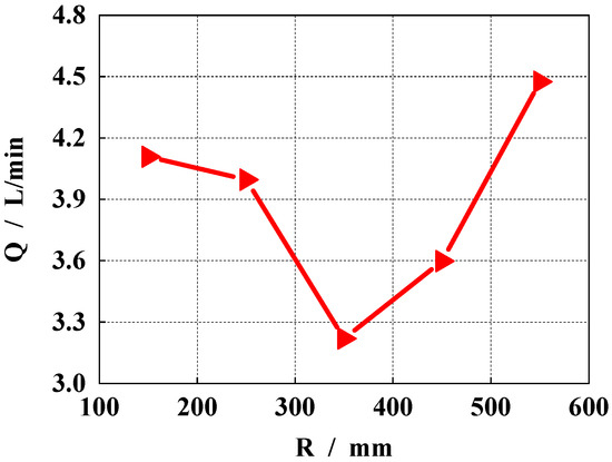 Figure 13 shows the influence of different spherical radii on the outlet flow pulsation. It can be seen that with an increase in the spherical radius, the outlet flow pulsation of the pump decreases first and then increases. According to the extracted data, when the radius of the sphere is 150 mm, the outlet flow pulsation rate is 45.02%. When the radius of the sphere is 250 mm, the outlet flow pulsation is 44.12%. When the radius of the sphere is 350 mm, the outlet flow pulsation is 42.05%. When the radius of the sphere is 450 mm, the outlet flow pulsation is 43.63%. When the radius of the sphere is 550 mm, the outlet flow pulsation is 48.35%, and the maximum and minimum flow pulsation difference is about 6.3%. According to the size of the flow pulsation rate, the optimal spherical radius is 350 mm.