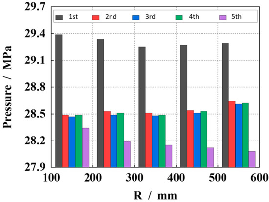 Figure 15 shows the influence of different spherical radii on pressure shock in the piston cylinder. It can be seen that with an increase in spherical radius, the pressure shock of different stages in the piston cavity changes differently. In general, the pressure shock at 350 mm is the smallest.