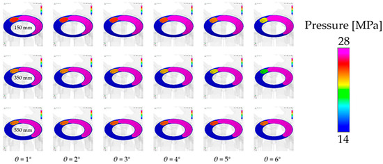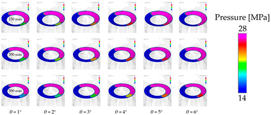 Figure 18 shows the gap oil film pressure distribution during the pre-pressure relief of the piston pump under different spherical radii (150 mm, 350 mm, and 550 mm; three groups). In order to better represent the pre-pressure relief effect, the pressure interval range under each cylinder block angle is independently set. The pressure range is 15 MPa~22 MPa when the cylinder block angle is 6°, and the pressure range is 10 MPa~12 MPa. It can be seen from the figure that with the rotation of the cylinder block, the pre-pressure relief speed of 350 mm is the fastest, the pre-pressure relief speed of 150 mm is the second fastest, and the pre-pressure relief speed of 550 mm is the slowest. With an increase in the pre-pressure relief speed, the pressure in the piston cavity can drop faster under the same cylinder block angle, which can complete the pre-pressure relief process faster and carry out the next stage of the oil absorption work.
