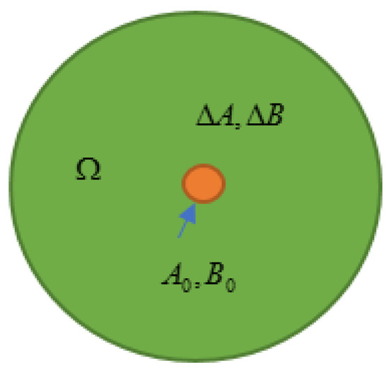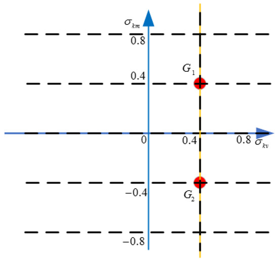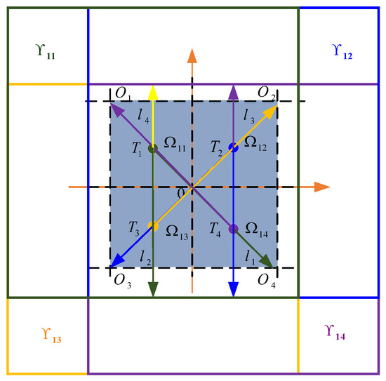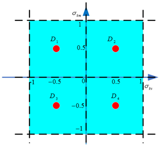 From the above, it is necessary to segment the uncertainty domain of a fault and set the auxiliary center point to design a progressive optimal fault-tolerant control algorithm according to the aforementioned control method. Furthermore, to determine the center point for each segmented domain as an auxiliary center point more easily, grid segmentation is selected as a division method for the uncertainty domains of a fault. The number of grids to be divided is determined according to the specific uncertainty domain. Then, the center points of each grid are regarded as auxiliary center points to design a controller. For the rectangle uncertainty domain of a fault, as shown in Figure 3, the uncertainty domain is divided into four grids, denoted by , and . The grid center points of each grid are used as auxiliary center points.
