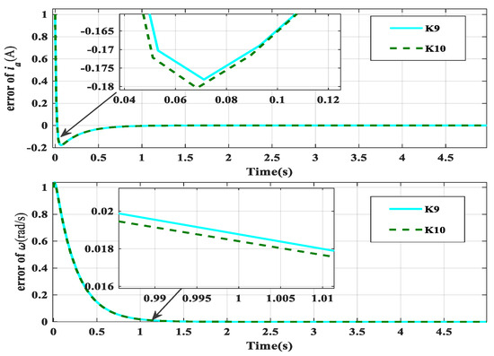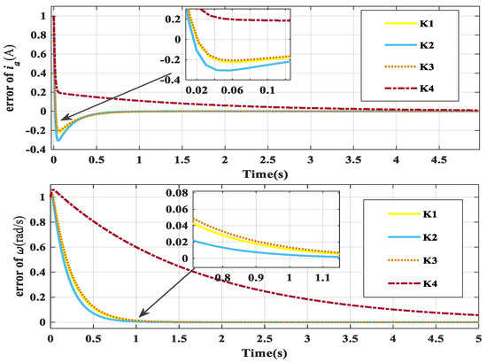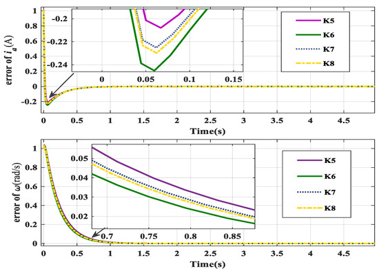 The purpose of the simulation is to regulate the output error of , which represents the armature current and angular velocity error, to be near zero under a fault. The normal parameter values used in the simulations are presented in Table 1.